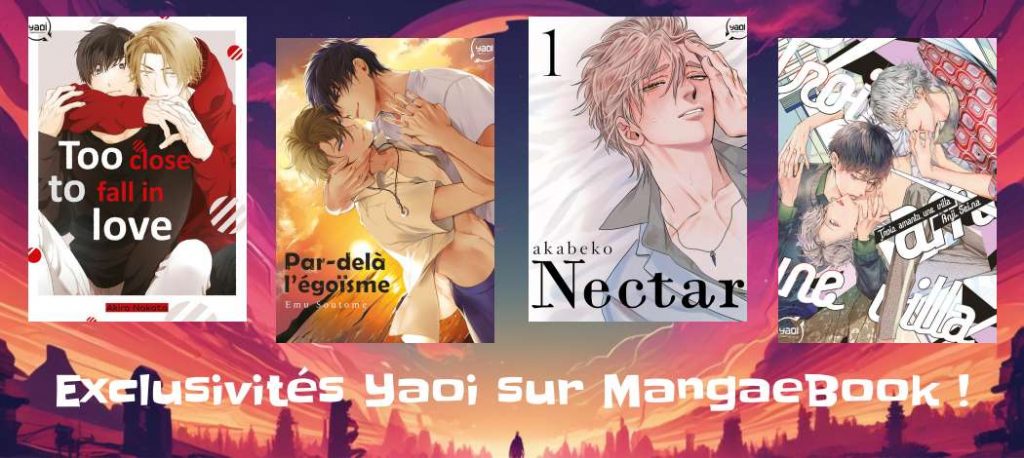 Parmi ces titres, on trouve Too close to fall in love d’Akira Nakata, qui explore la relation complexe entre deux demi-frères. Par-delà l’égoïsme d’Emu Sotome met en scène une lutte de pouvoir entre deux personnages charismatiques. Nectar d’akabeko, premier tome d’une série en cours, aborde les questionnements d’un host après une nuit bouleversante.