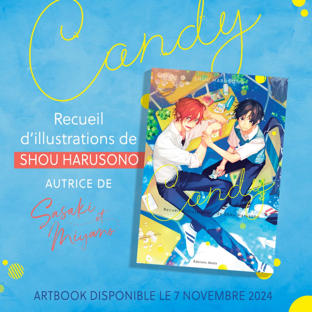 Candy, le premier recueil d’illustrations de Shou Harusono, sera disponible en France début novembre. Cet ouvrage au format A4 avec jaquette rassemble une sélection d’œuvres de l’autrice de Sasaki et Miyano sur 140 pages, offrant aux lecteurs un aperçu approfondi de son travail artistique.