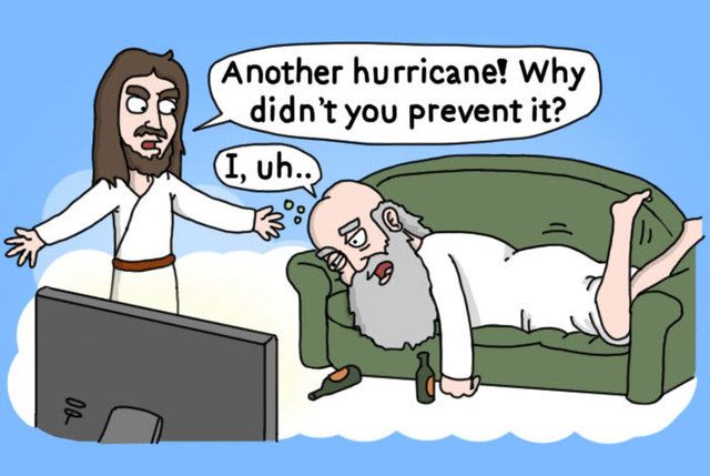 Le Seigneur est bien trop occupé avec ses problèmes d’alcool qu’il en oublie de s’occuper des humains et prendre soin d’eux. Il exauce tout de même parfois leurs vœux, mais pas toujours de la manière que Jésus auraient souhaitée.