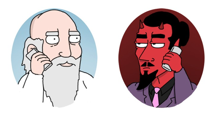 Le diable est agacé par son collègue le maître du ciel. Dieu ne le respecte d’ailleurs pas tant que ça, il le harcèle au téléphone et l’appelle Lucie au lieu de Lucifer.