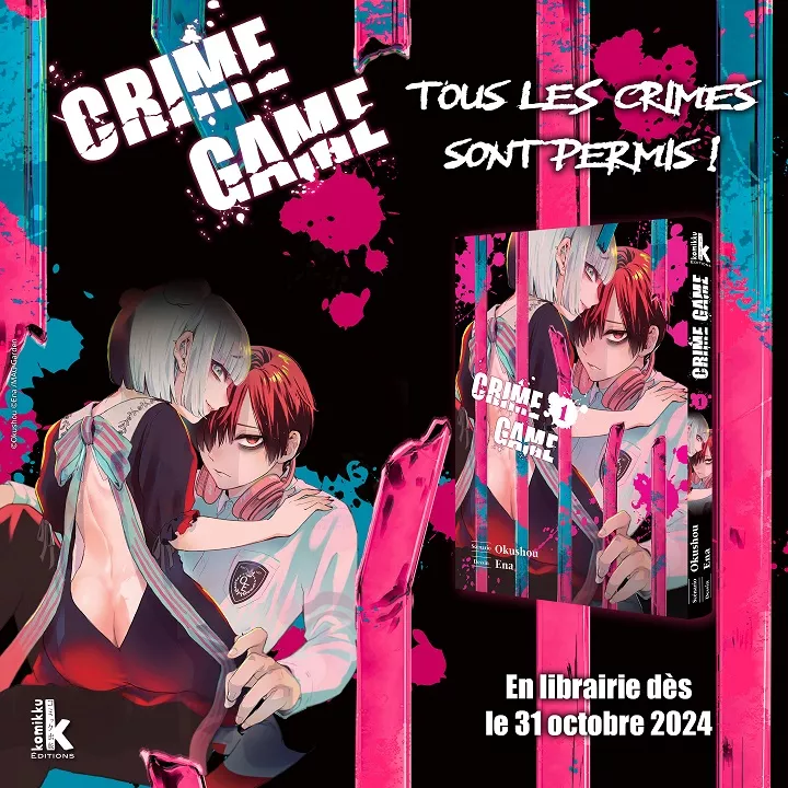 Crime Game sera disponible en librairies à partir du 31 octobre 2024, publié par les éditions Komikku au prix de 8,50€ pour le premier tome.