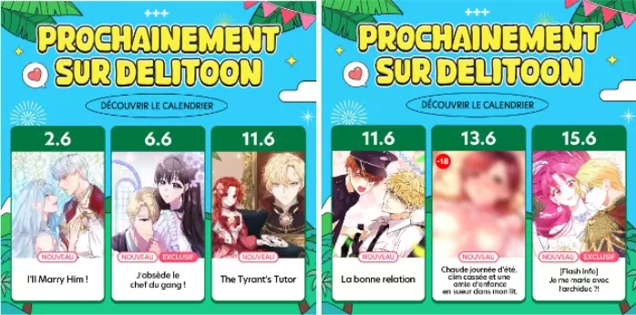 Lancée en 2011, Delitoon est l’une des plateformes les plus viables du marché, spécialisée dans la diffusion de romances et d’actions tout public. En juin, treize nouveaux webtoons ainsi que des événements saisonniers ont fait leur apparition sur la plateforme.