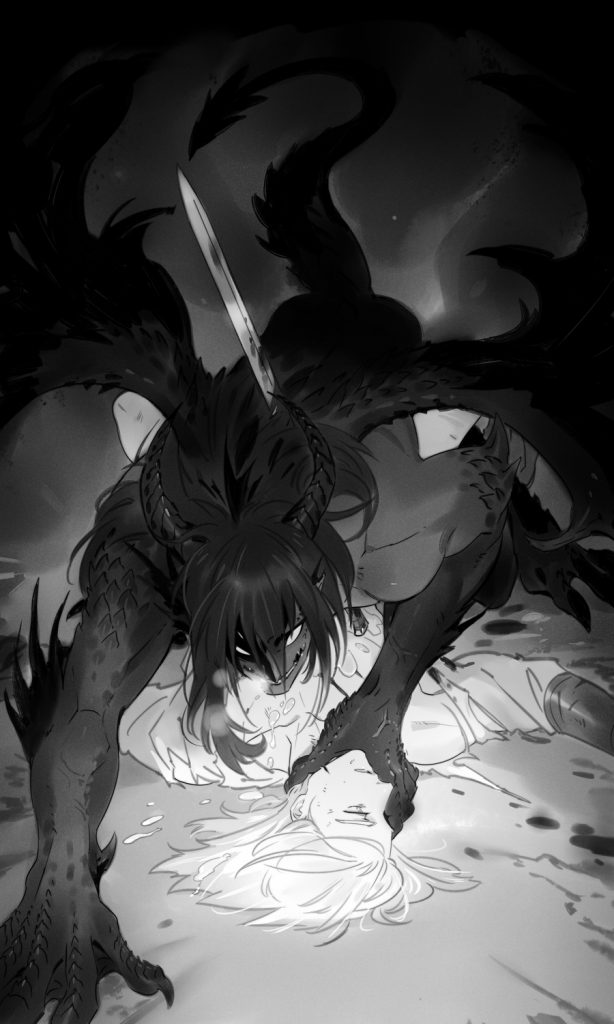 Le tout est mis en valeur par des dessins maîtrisés et magnifiques, avec un choix artistique de noir et blanc, qui met davantage l’emphase sur le contraste entre le chevalier blanc Snow et le dragon noir Tungsten.
