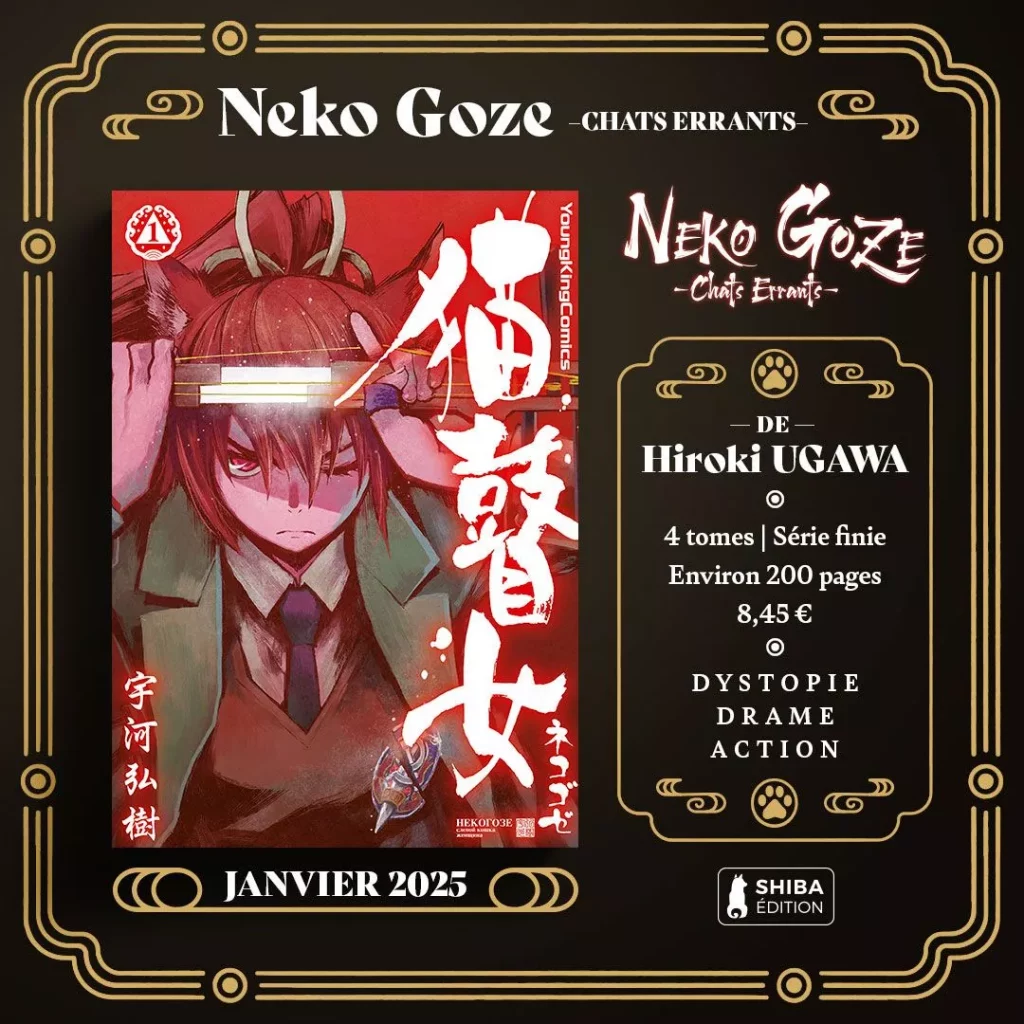 Neko Goze -Chats Errants- verra son premier tome paraître en librairie le 31 janvier 2025, au prix de 8,45€. Cette série en quatre volumes est éditée en France par les éditions Shiba et signée par Hiroki Ugawa.