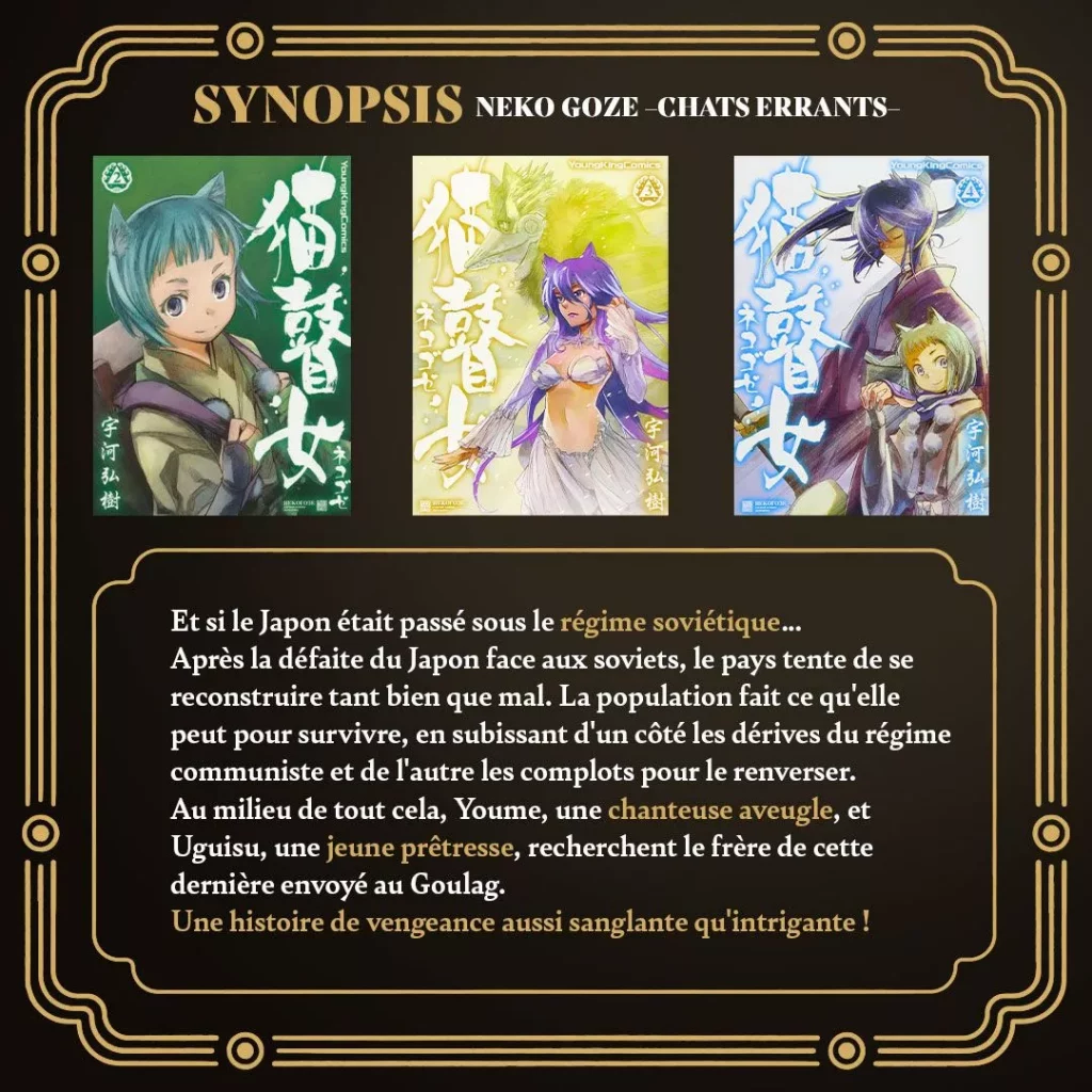 Neko Goze -Chats Errants-, un nouveau manga dystopique, sera publié en France par les éditions Shiba à partir de janvier 2025. Cette œuvre, qui mêle action et drame dans un Japon alternatif sous régime soviétique, marque le retour de l’auteur Hiroki Ugawa sur le marché français.
