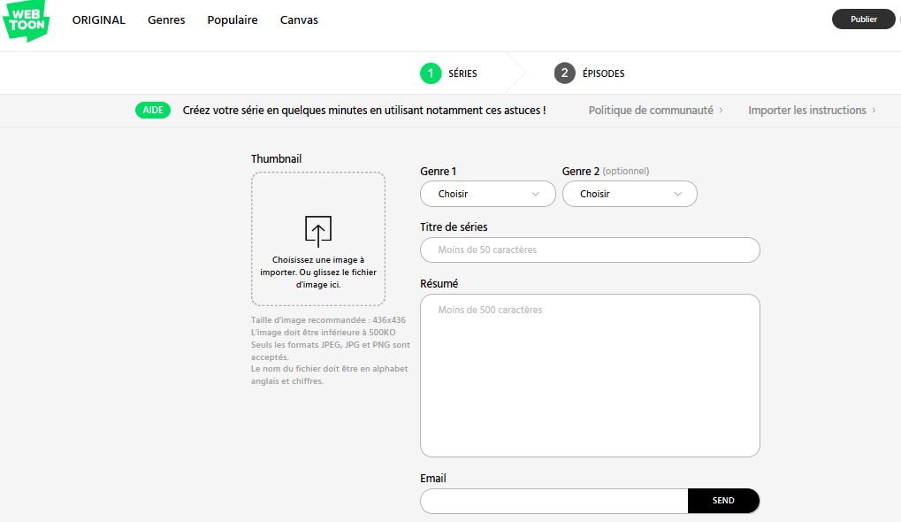 La première chose à savoir, c’est que n’importe qui peut se lancer et publier son webtoon. Vous, moi, Donald Trump… Il suffit d’avoir une bonne idée, de s’y connaître en dessin (ou de s’associer avec un illustrateur) et d’avoir une connexion Internet pas trop pourrie. Une fois que vous avez dessiné quelques chapitres, rédigé un scénario et que vous être prêts à vous lancer, la seule chose qui vous reste à faire de vous connecter sur Canvas et de cliquer sur « Publier ». Ensuite, à vous de présenter votre série : il vous faut choisir une image de présentation et un titre, sélectionner le(s) genre(s) auxquels votre série correspond et écrire un petit résumé accrocheur. Tous ces éléments feront figure de « vitrine » pour votre webtoon – faites donc en sorte qu’ils donnent envie.